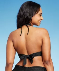 Bring retro charm to your swimwear with the Crochet Trim Halter Bikini Top from Kona Sol™. This swim top features a solid black hue with contrasting white crochet detail. The deep V-neckline lends a playful vibe, while the back and neck tie closures give you a customizable fit. Made with soft and stretchy fabric blend and complete with removable cups, this halter swim top helps keep you comfortable whether you’re diving in, enjoying the sand or just strolling the boardwalk.