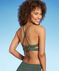 Feel fabulous poolside wearing this Crossback Seamed Bralette Bikini Top from Kona Sol™. Made from stretchy fabric for flexible comfort, this bralette bikini top is fashioned in a solid green color with seamed detailing for chic style. The crisscross back with a tie closure provides a secure, worry-free fit and the removable cup inserts offer customizable coverage. Complete your look with a matching or contrasting swim bottom, a pair of sunnies and flip-flops.
