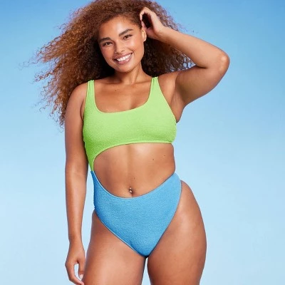 Two-tone one-piece swimsuit from Wild Fable™. Features cutout on one side along with high-leg design. Soft and stretchy fabric construction with U back. Pull-on style for easy slip on and take off.