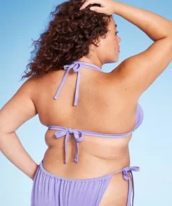 Lurex plisse triangle halter bikini top from Wild Fable™ in purple. Made from soft fabric with four-way stretch and full lining for flexible comfort in and out of the water. Sewn-in cups offer confident coverage. Back and behind-the-neck ties provide a stay-put fit. A center-front floral charm completes the look and elevates the design.