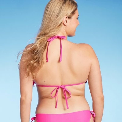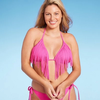 Funky fringe-detail triangle bikini top from Wild Fable™ in a solid color. Made of a soft, stretchy fabric and sporting removable cups. Halter-style behind-the-neck tie and string back tie fastening complete the look with a customizable fit.