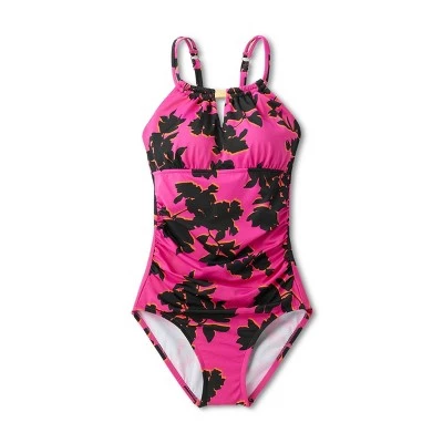 This Aqua Green® one piece is the perfect balance of fashion and comfort for your next travel destination. The sleek highneck design offers a double tunnel neckline featuring a center front keyhole with an elegant hardware detail. The shirred midsection and adjustable straps finish this style for a confident look and customizable fit.