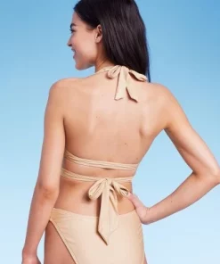 Gold bralette bikini top from Wild Fable™ tailored in a longline silhouette with a wrap front. Made of stretchy fabric with full lining and comes with removable cups. Back tie and halter straps complete the look with a custom fit.