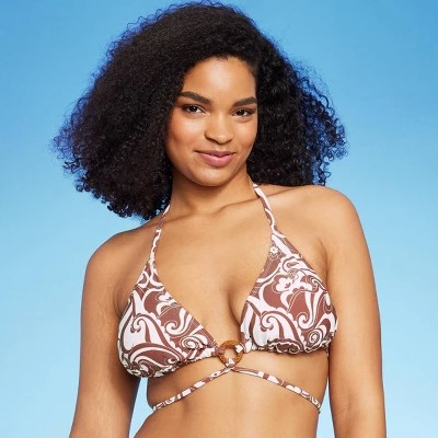 Strappy triangle bikini top from Wild Fable™ with a center-front ring with trailing back ties. Made from soft fabric with spandex and full lining for stretchy comfort in and out of the water. Behind-the-neck ties and a back strap with hook closure finish off the stylish look with a customizable fit.