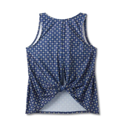 Take your sunny look up a notch with this Tie-Back Tile Print Tankini Top from Kona Sol™. This sleeveless tankini top is covered with allover tile print and sports a keyhole knot back for an eye-catching look that’s perfect for poolside lounging or taking a stroll by the beach. Made from soft, stretchy fabric with opaque lining, this printed tankini top helps keep you comfortable throughout water adventures, while removable cups offer a customizable fit.