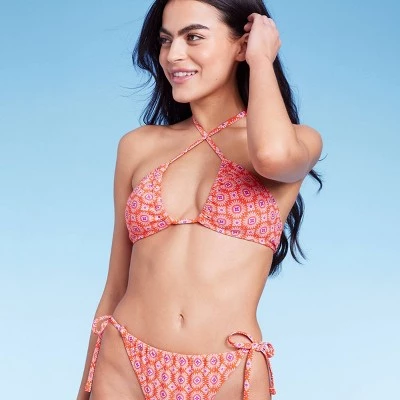 Orange bikini top from Wild Fable™ features a deep U neckline. Covered with tile print, and made with soft and stretchy fabric for comfortable wear. Back tie with halter straps helps keep the top secure. Strappy design gives you multiple options for styling. Removable cups provide customizable coverage.